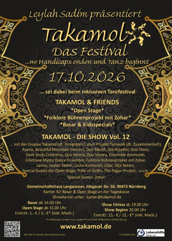 Abends folgt eine grandiose Galashow mit den Gruppen Takamol und dem Inklusionstanzprojekt Tamasok. Zum 11. Mal präsentieren Leylah Sadim, Initiatorin von Takamol & Tamasok und ihr